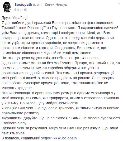 Автор уничтоженных "Икон Революции" на фасаде дома на улицы Грушевского в Киеве, социальный художник Sociopath высказался против их восстановления группой художников и хочет сделать это лично. Об этом он написал в Facebook.