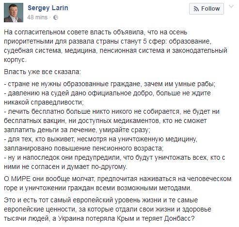 "Власть на согласительном совете объявила, что приоритетными для развала страны станут 5 сфер: образование, судебная система, медицина, пенсионная система и законодательный корпус. Власть уже все сказала: