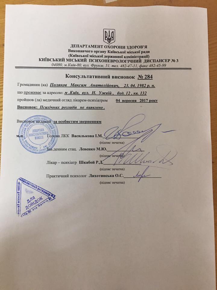 Справка из психиатрии Фото: facebook.com/polyakovma
