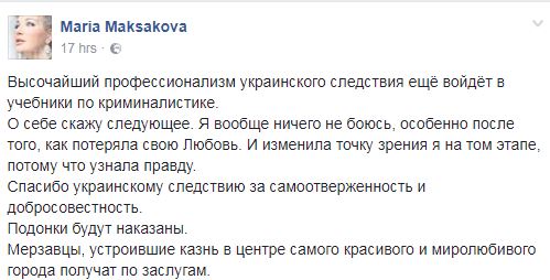 "Высочайший профессионализм украинского следствия еще войдет в учебники по криминалистике", – отметила Максакова.