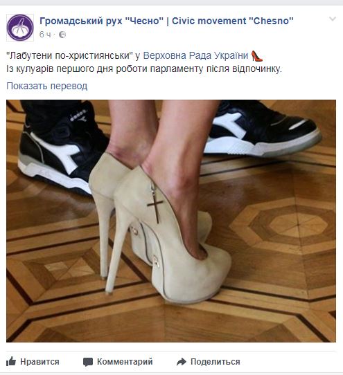 "Лабутены по-христиански" в Верховной Раде. Из кулуаров первого дня работы парламента после отдыха", – говорится в заметке.