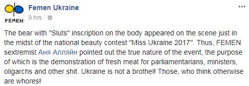 Активистка выскочила на сцену оголенная и в маске медведя и надписью на груди "Sluts" (Шлюхи, - пер.).