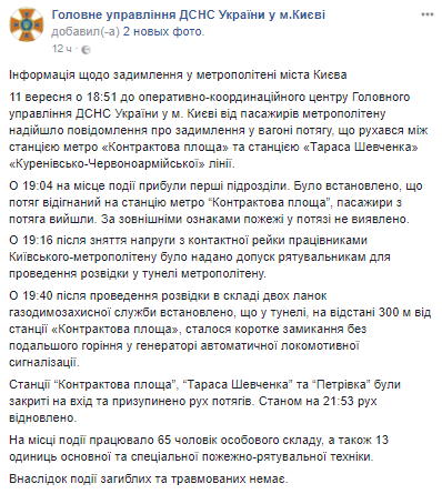 "В 19.40 после проведения разведки в составе двух звеньев газодымозащитной службы установлено, что в тоннеле на расстоянии 300 метров от станции "Контрактовая площадь" произошло короткое замыкание без последующего горения в генераторе автоматической локомотивной сигнализации", - информируют в ГосЧС.