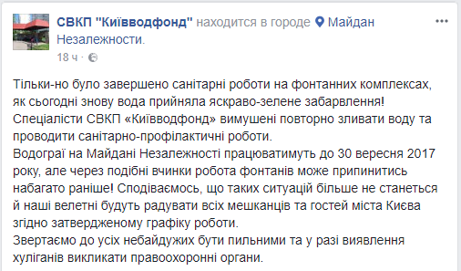 При этом "Киевводфонд" сообщил, что может отключить фонтаны на Майдане Независимости досрочно из-за хулиганов, которые высыпают в воду красители. Об этом сообщает пресс-служба предприятия в Facebook.