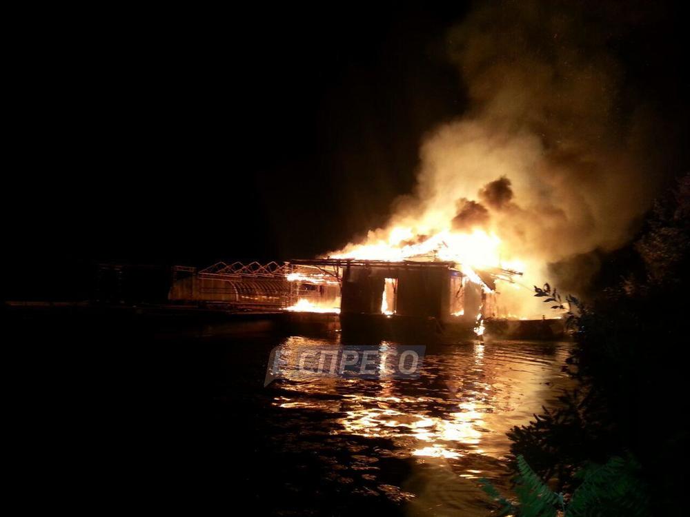 Отмечается, что ночью был сильный ветер, и плавучее сооружение пылало как факел.