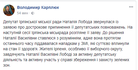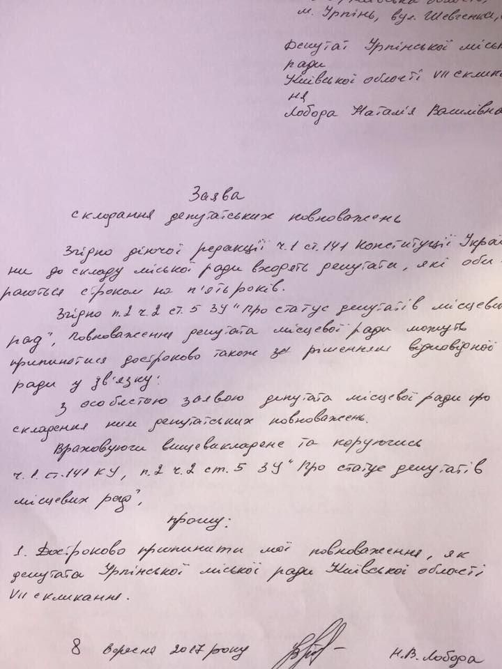 "Депутат Ирпенского городского совета Наталья Лобода обратилась с заявлением о досрочном прекращении ее депутатских полномочий", - написал он и разместил фотокопию заявления Лободы.