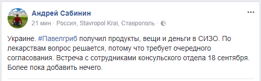 Украинец Павел Гриб получил в СИЗО Краснодара продукты, вещи и деньги. Вопрос с лекарствами еще решается, сообщил его адвокат Андрей Сабинин в Facebook.