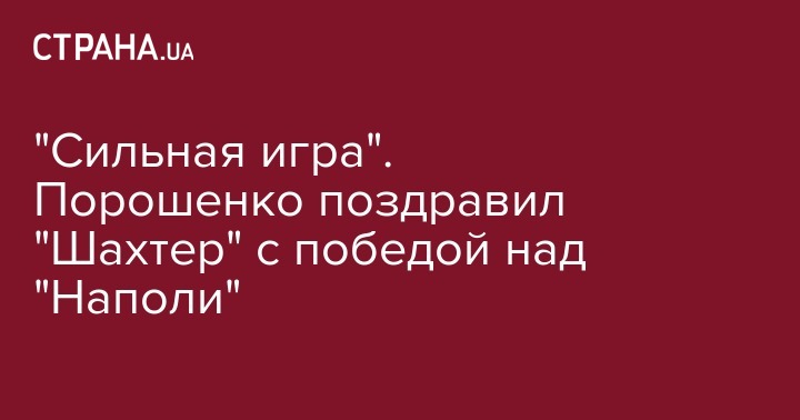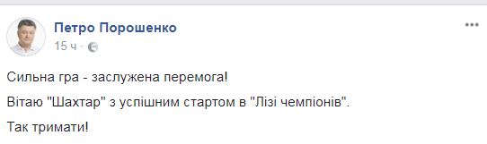 "Сильная игра - заслуженная победа! Поздравляю "Шахтер" с успешным стартом в "Лиге чемпионов". Так держать!", - написал Порошенко на своей странице в Facebook.