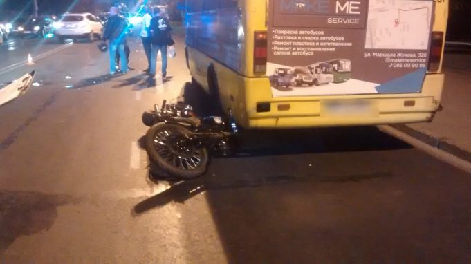 Водитель мотоцикла Suzuki, выехавший на встречную полосу, сбил на женщину, которая переходила проезжую часть в неустановленном месте. После наезда на женщину мотоцикл потерял управление и врезался в маршрутный автобус БАЗ, стоящий на остановке для посадки и высадки пассажиров.