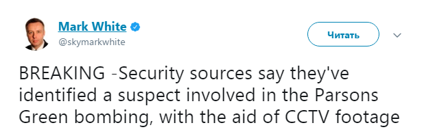 "Источники в силовых структурах сообщают, что они установили личность подозреваемого в подрыве бомбы на "Парсонс-Грин", - написал корреспондент Марк Уайт.
