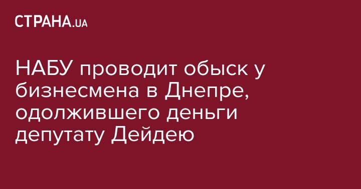 "Следственные действия проводятся в соответствии с постановлением суда и являются логическим продолжением расследования детективами НАБУ фактов возможного незаконного обогащения народного депутата Евгения Дейдея, которое было начато в ноябре 2016 года. Обыски проходят в городе Днепр и Днепропетровской области по месту работы и жительства предпринимателя, который, по словам депутата, занял средства семье народного избранника", - говорится в сообщении.