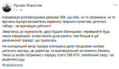 "Информация распространенная некоторыми СМИ, будто бы, или задержана, или вручено подозрение руководителю творческого коллектива детского лагеря - не соответствует действительности", – написал Форостяк.