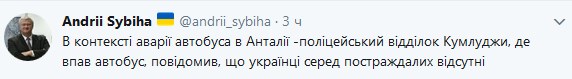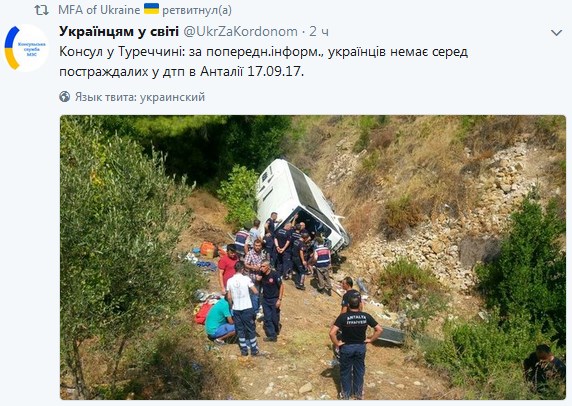 "В контексте аварии автобуса в Анталии полицейский участок Кумлуджи, где упал автобус, сообщил, что украинцы среди пострадавших отсутствуют", - написал посол.
