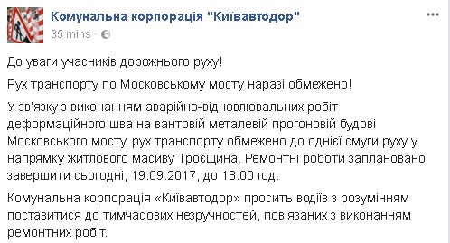 "В связи с выполнением аварийно-восстановительных работ деформационного шва на вантовом металлическом прогоновом строении Московского моста, движение транспорта ограничено до одной полосы движения в направлении жилого массива Троещина. Ремонтные работы планируется завершить сегодня, 19.09.2017, до 18.00", - сказано в сообщении.