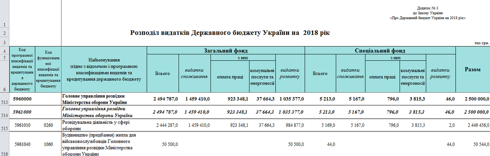 В проекте говорится, что расходы для Главного управления разведки Минобороны увеличены по сравнению с 2017 годом на 1 млрд 47 млн 45,7 тыс. грн.