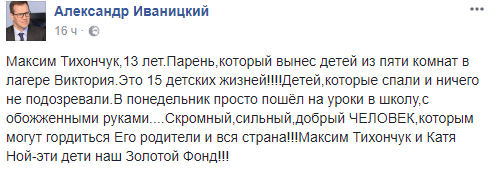 "Максим Тихончук, 13 лет. Парень, который вынес детей из пяти комнат в лагере "Виктория". Это 15 детских жизней!!!! Детей, которые спали и ничего не подозревали. В понедельник просто пошёл на уроки в школу,с обожженными руками. Скромный,сильный, добрый ЧЕЛОВЕК, которым могут гордиться Его родители и вся страна!!! Максим Тихончук и Катя Ной - эти дети наш Золотой Фонд!!!" - написал депутат.