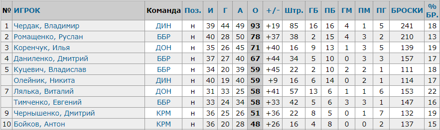 6. ХК Волки 40 3 0 0 0 0 37 98-294 9