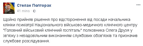 Министерство обороны отстранило от должности начальника клиники психиатрии Национального военно-медицинского клинического центра Олега Друзя. Об этом на своей странице в Facebook написал глава Министерства обороны Степан Полторак.