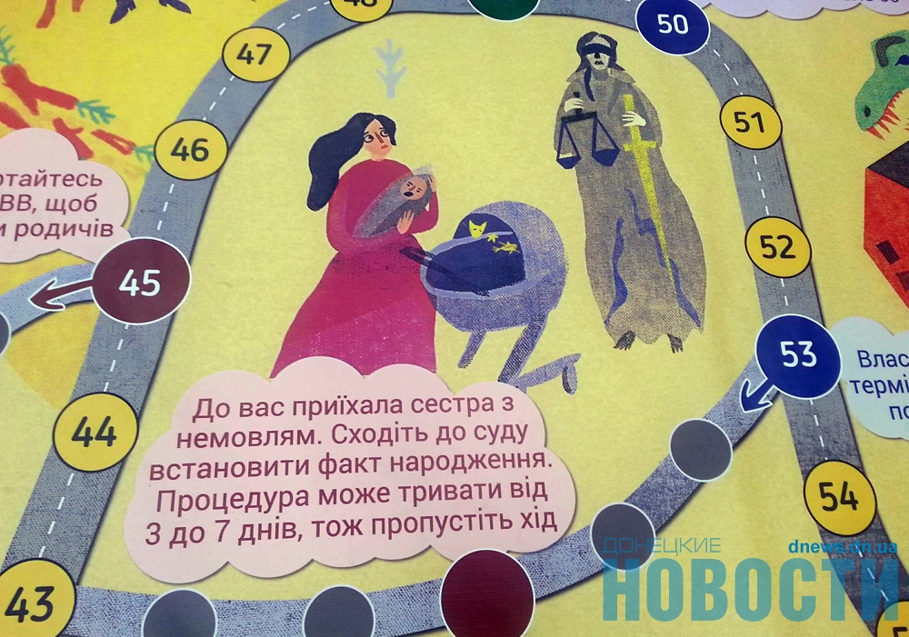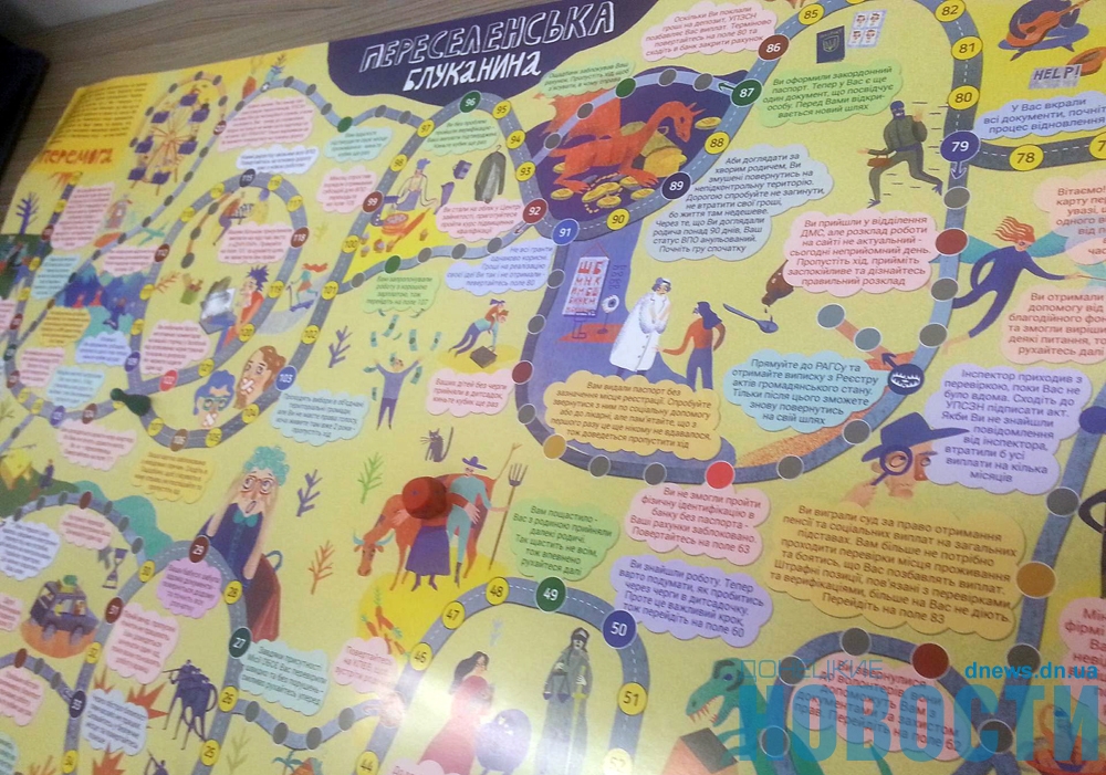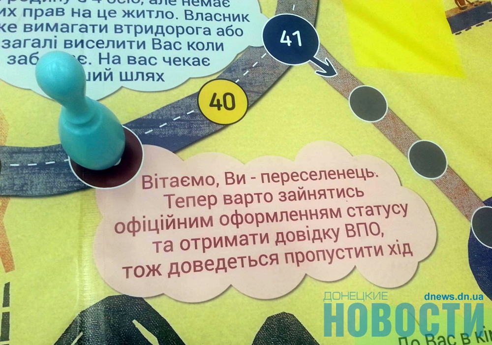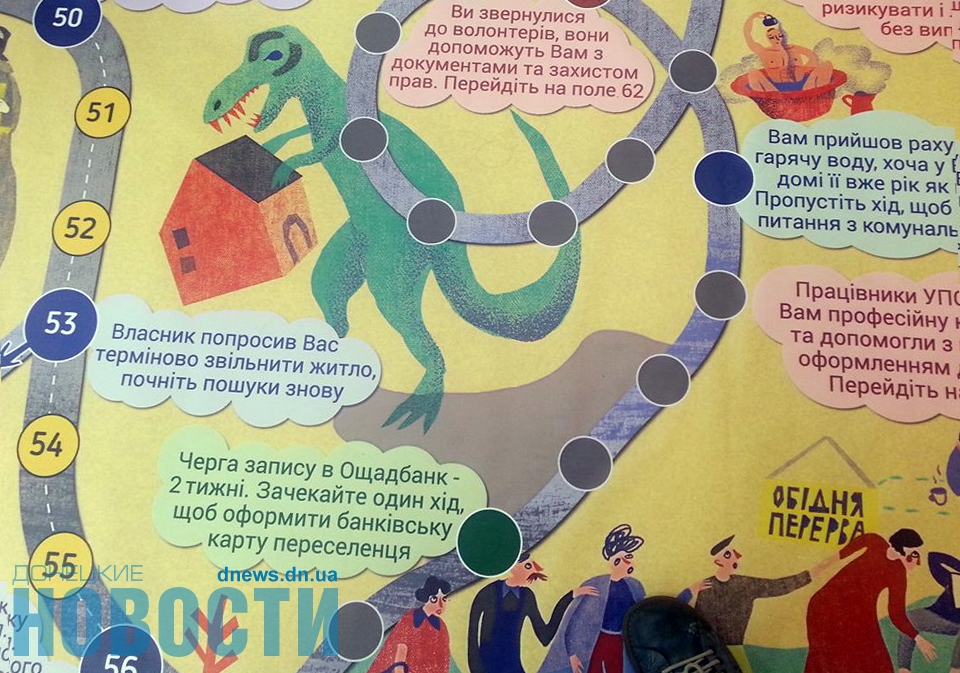 "Мы предлагаем игрокам перевоплотиться во внутренне-перемещенное лицо и попробовать пройти путь, который хорошо известен каждому переселенцу. По очереди кидайте кубик и передвигайте фишки на то количество ходов, которое выпадет. Читайте описание ситуации и дальнейшие указания к действиям. Если не хватает сил двигаться вперед, Вы всегда можете вернуться жить на неподконтрольную территорию", - описывают создатели суть иры.