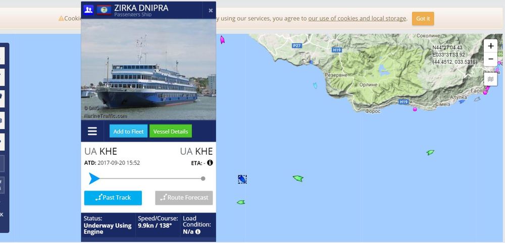 Так, вчера днем около 15.00, теплоход вышел из порта приписки Херсон. Никаких круизов в данное время года заявлено не было. Владельцем значится все та же круизная компания "Червона Рута", что и в случае с теплоходом "Генерал Ватутин".