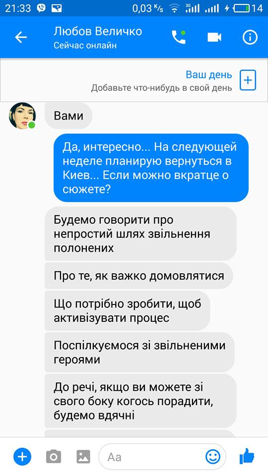Он также приводит интернет-переписку одного из военнопленных, которому он помог выйти из плена и Любовь Величко, которая говорит, что снимает сюжет для программы "Наши деньги"