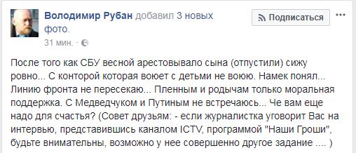 "После того как СБУ весной арестовывало сына (отпустили) сижу ровно... С конторой которая воюет с детьми не воюю. Намек понял... Линию фронта не пересекаю... Пленным и родычам только моральная поддержка. С Медведчуком и Путиным не встречаюсь... Че вам еще надо для счастья? (Совет друзьям: - если журналистка уговорит Вас на интервью, представившись каналом ICTV, программой "Наши Гроши", будьте внимательны, возможно у нее совершенно другое задание .... )", - написал Рубан.
