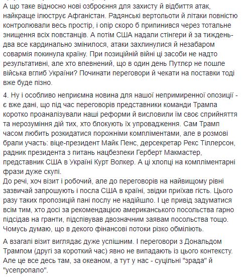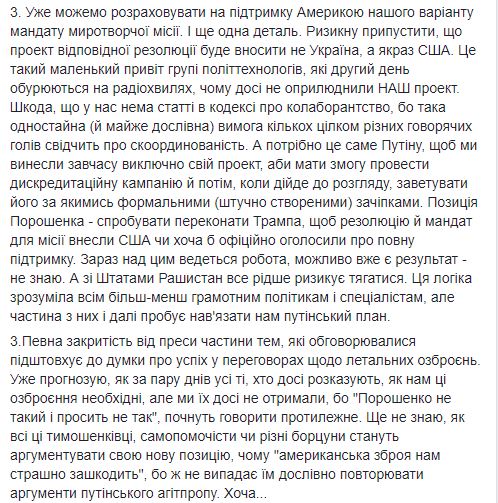 Потом он добавил: "Как и предполагалось, встреча Трампа и Порошенко - оказалась безрезультатной. Интересно, что решение проблемы Донбасса (без Крыма) - на последнем месте. Проблема коррупции и бизнес-климата - на первом. Я, конечно, могу ошибаться - но из такого формулирования я делаю вывод, что рассчитывать на дальнейшую поддержку Штатов Петру Алексеевичу не стоит. И вопрос коррупции в Украине - уже адресован ему лично. А это для ПАП и Ко плохой знак".