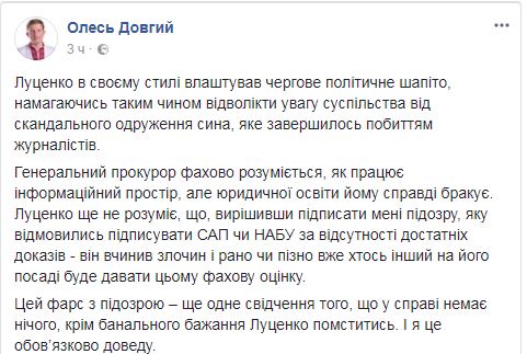 "Луценко в своем стиле устроил очередное политическое шапито, пытаясь таким образом отвлечь внимание общества от скандального бракосочетания сына, которое завершилось избиением журналистов. Генеральный прокурор профессионально понимает, как работает информационное пространство, но юридического образования ему действительно не хватает. Луценко еще не понимает, что, решив подписать мне подозрение, которое отказались подписывать САП или НАБУ из-за отсутствия полноты доказательств - он совершил преступление и рано или поздно уже кто-то другой на его должности будет давать этому профессиональную оценку. Этот фарс с подозрением - еще одно свидетельство того, что в деле нет ничего, кроме банального желания Луценко отомстить. И я это обязательно докажу", - сообщил политик.
