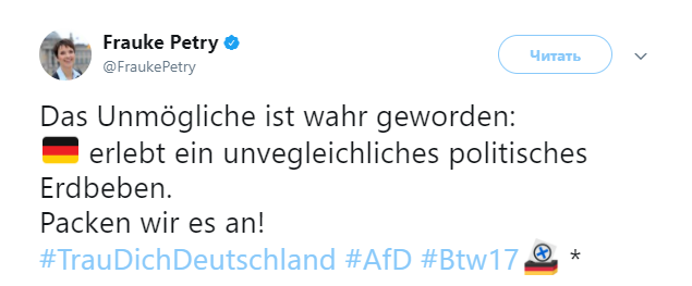 Сопредседатель АдГ Фрауке Петри считает успех партии на парламентских выборах "политическим землетрясением", о чем она написала на своей странице в Twitter.