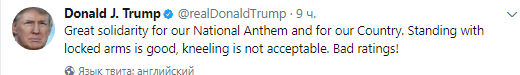 "Прекрасное проявление солидарности по отношению к нашему национальному гимну и к нашей стране! Стоять, сцепившись руками, - это хорошо, а вставать на колени неприемлемо", - написал Трамп.