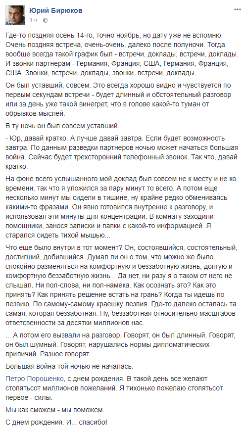 Особняком на фоне многочисленных злопыхателей смотрится пост Юрия Бирюкова, советника президента: "Где-то поздняя осень 14-го, точно ноябрь, но дату уже не вспомню. Очень поздняя встреча, очень-очень, далеко после полуночи. Тогда вообще всегда такой график был - встречи, доклады, встречи, доклады. И звонки партнерам - Германия, Франция, США, Германия, Франция, США. Звонки, встречи, доклады, звонки, встречи, доклады... Он был уставший, совсем. Это всегда хорошо видно и чувствуется по первым секундам встречи - будет длинный и обстоятельный разговор или за день уже такой винегрет, что в голове какой-то туман от обрывков мыслей. В ту ночь он был совсем уставший.