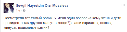 Севгиль Мусаева, журналист: "Посмотрела тот самый ролик. У меня один вопрос -а кому жена и дети президента так дружно машут в конце?)) ваши варианты, плюсы, минусы, подводные камни?"