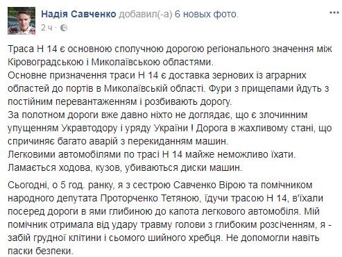 "Сегодня, в 5 часов утра, я с сестрой Савченко Верой и помощником народного депутата Проторченко Татьяной на трассе Н14 въехали посреди дороги в ямы, глубиной до капота легкового автомобиля. Мой помощник получила от удара травму головы с глубоким рассечением, я – ушиб грудной клетки и шейного позвонка. Не помогли даже ремни безопасности", – написала Савченко.