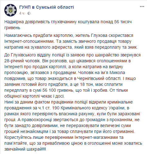 В городе Глухов Сумской области мужчина перечислил мошеннику более 56 тыс гривен за купленный через интернет картофель. Об этом сообщили в отделе коммуникации главного управления национальной полиции в Сумской области.