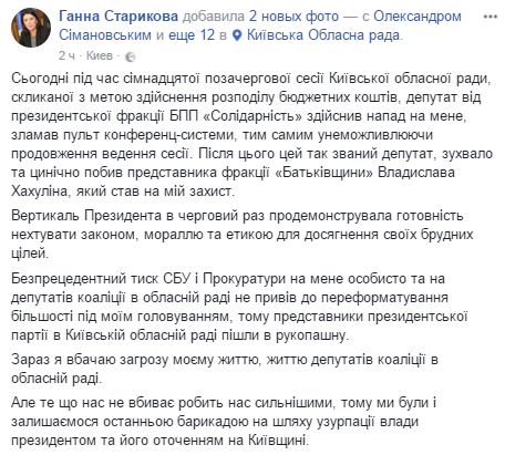 "Беспрецедентное давление СБУ и прокуратуры на меня лично и на депутатов коалиции в областном совете не привел к переформатированию большинства под моим председательством, поэтому представители президентской партии в Киевском областном совете пошли в рукопашную", - написала Старикова.