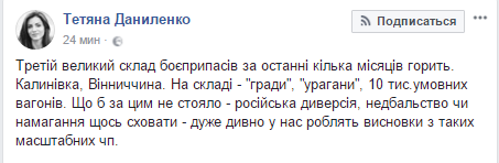 Журналистка Татьяна Даниленко, тем временем, удивляется горению третьего за несколько месяцев складов (вероятно имея ввиду случай в Мариуполе и в Балаклее) с вооружениями. Она не предполагает, кто виноват, но делает вывод, что выводов из масштабных ЧП не делается.