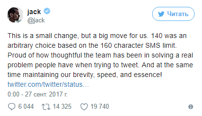 Основатель Twitter Джек Дорси одним из первых вышел за рамки 140 символов: "Это пусть и маленькая перемена, но большой шаг для нас. 140 символов - это был случайный выбор, основанный на 160 символах в лимите SMS-сообщений. Горжусь тем, насколько вдумчиво подошла команда к решению проблемы, с которой сталкивались люди, пытаясь написать твит. И при этом им удалось сохранить нашу краткость, скорость и сущность!" - написал он.