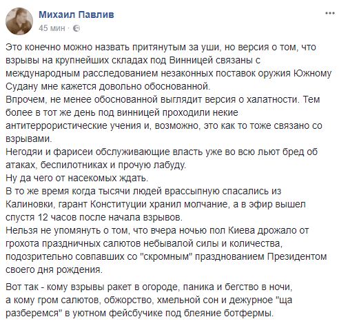 "Это точно диверсия. В связи с этим, и нашими разведданными еще с 25 числа в Винницкой области под видом антитеррористических учений были проведены обыски и преследования диверсионных групп. Да, это дело не одного человека. И два дня проходили поиски и ведение этих групп. Основная масса их была задержана. Основная масса, но не все. Поэтому одна группа смогла доставить на беспилотнике взрывное устройство", – написал в Facebook сотрудник Главного управления развития и сопровождения материального обеспечения ВСУ Сергей Мисюра.
