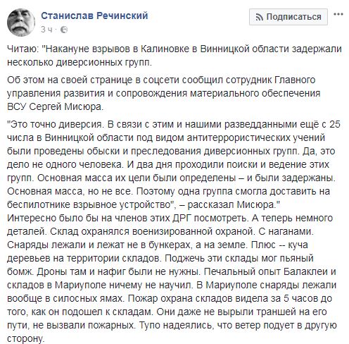Речинский приводит слова сотрудника Главного управления развития и сопровождения материального обеспечения ВСУ Сергея Мисюры: "Накануне взрывов в Калиновке в Винницкой области задержали несколько диверсионных групп. "Это точно диверсия. В связи с этим и нашими разведданными ещё с 25 числа в Винницкой области под видом антитеррористических учений были проведены обыски и преследования диверсионных групп. Да, это дело не одного человека. И два дня проходили поиски и ведение этих групп. Основная масса их цели были определены – и были задержаны. Основная масса, но не все. Поэтому одна группа смогла доставить на беспилотнике взрывное устройство".