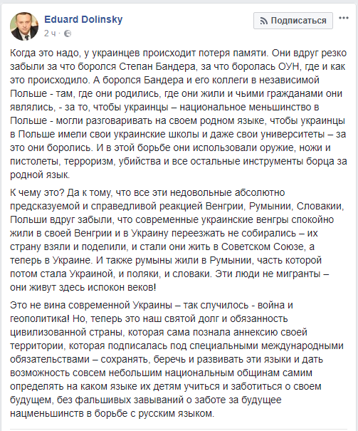 Директор Украинского еврейского комитета Эдуард Долинский напоминает, что даже любимый украинскими властями Степан Бандера боролся за самостоятельность украинского языка в Польше, который на тот момент был языком нацменьшинств в этом государстве.
