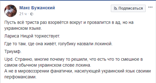 Он же добавляет: "Пусть все триста раз взорвется вокруг и провалится в ад, но на украинском языке".