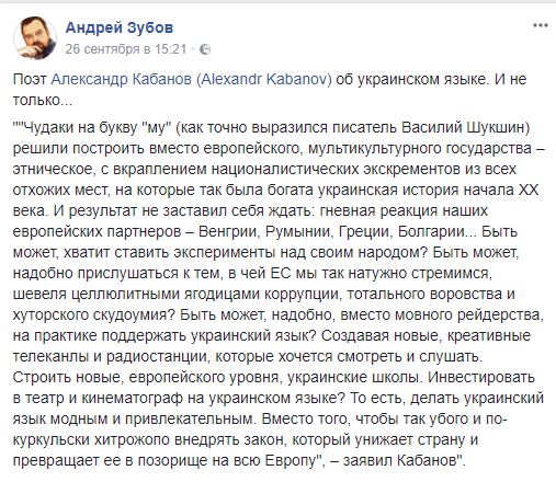 "Чудаки на букву "му" (как точно выразился писатель Василий Шукшин) решили построить вместо европейского, мультикультурного государства – этническое, с вкраплением националистических экскрементов из всех отхожих мест, на которые так была богата украинская история начала ХХ века. И результат не заставил себя ждать: гневная реакция наших европейских партнеров – Венгрии, Румынии, Греции, Болгарии... Быть может, хватит ставить эксперименты над своим народом?", - задается вопросом Кабанов.