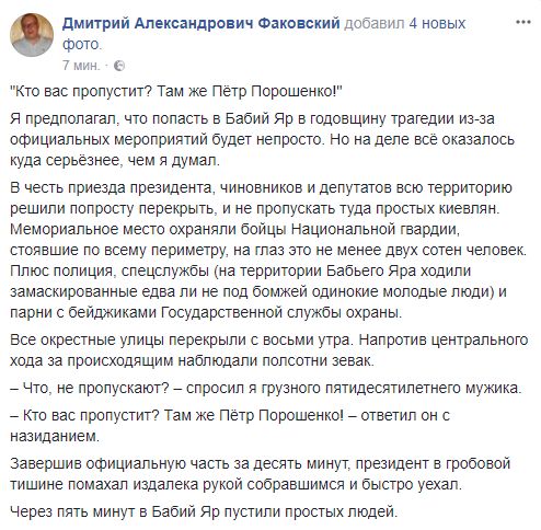 Дмитрий Факовский: "Кто вас пропустит? Там же Пётр Порошенко!" Я предполагал, что попасть в Бабий Яр в годовщину трагедии из-за официальных мероприятий будет непросто. Но на деле всё оказалось куда серьёзнее, чем я думал.