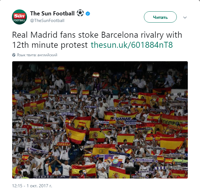13:39 Вчера фанаты мадридского "Реала" провели свою акцию против каталонского сепаратизма. Во время матча против "Эспаньола" болельщики на 12-й минуте поднялись со  своих мест с флагами Испании.