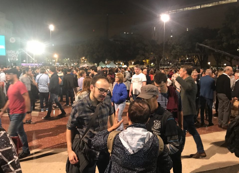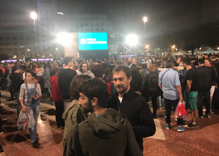 Люди ожидают результата голосования на площади Каталония в Барселоне. Там установлены экраны с надписями "Да здравствует демократия". Звучит музыка, люди подпевают.