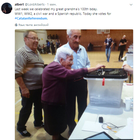 14:10  Пожилая женщина, которой тяжело ходить, идет голосовать. Собравшиеся каталонцы аплодируют ей.