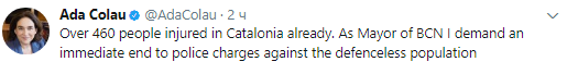 19:18 Мэр Барселоны Ада Колау написала в Twitter, что в день референдума в Каталонии пострадали порядка 460 человек.
