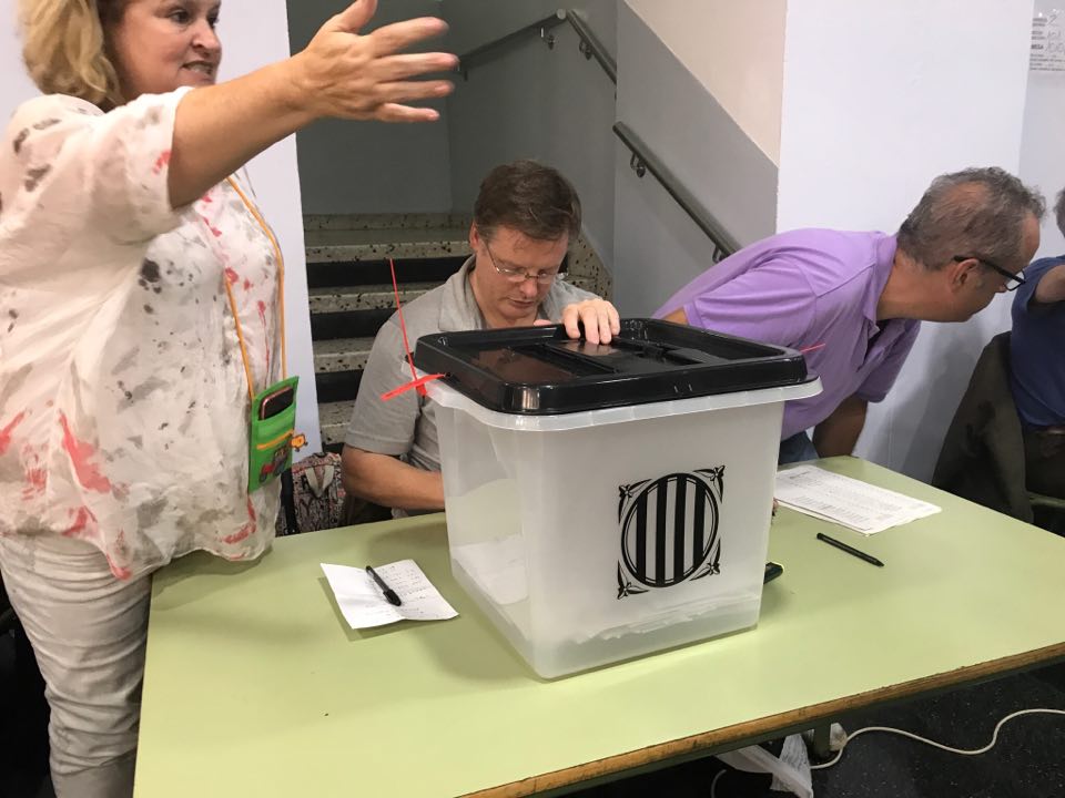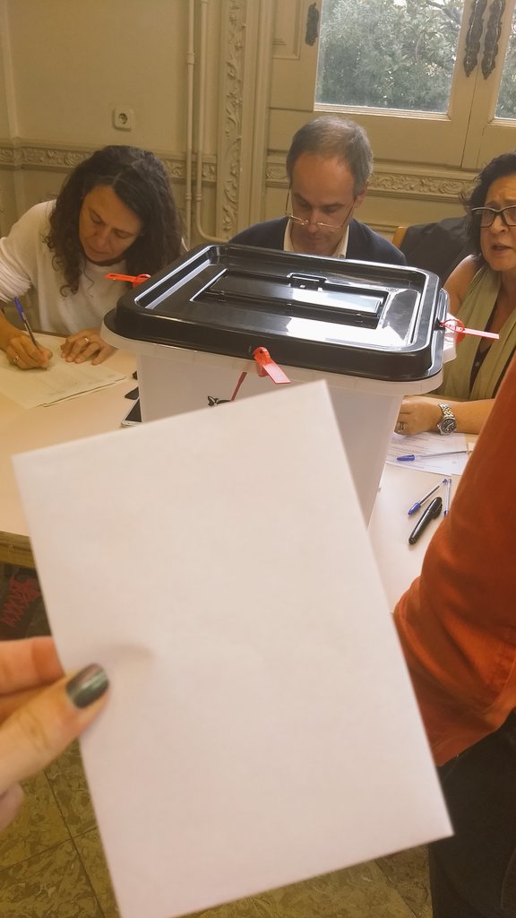 10:14  Референдум начался. На избирательный участок в самой большой школе Барселоны Escola del treball только что зашли 19 человек - они станут волонтерами и будут организовать голосование. Тысячи людей ожидают возможность проголосовать во дворе школы. Полиция обещала быть здесь в шесть утра, но никто не пришел. "Мы ждем, что в течение дня явится Гражданская гвардия", - говорит "Стране" волонтер Цави.