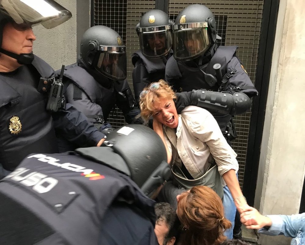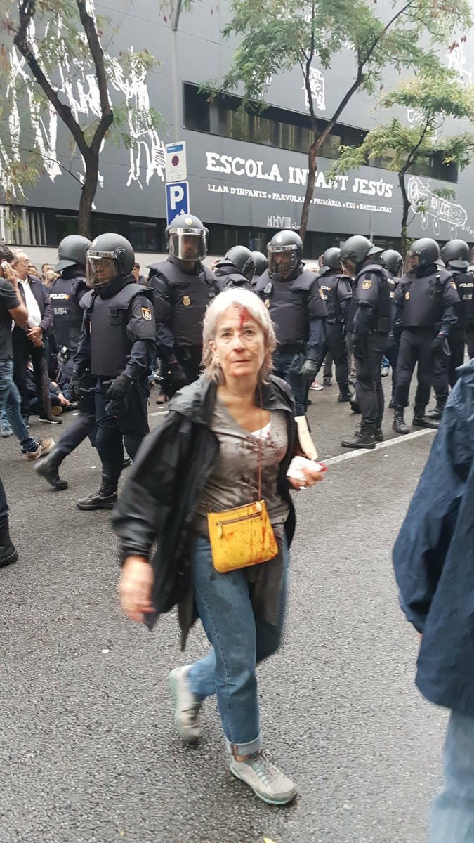 10:39  Окровавленная сторонница референдума, которая дралась с полицейским на видео ниже. Название избирательного участка совпадает с фамилией президента Каталонии - Пуджемонт. Это здание одной из центральных школ, где проходит референдум.