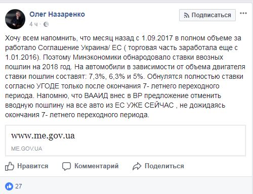 "Хочу всем напомнить, что месяц назад с 1.09.2017 года в полном объеме заработало Соглашение Украина/ЕС (торговая часть заработала еще с 1.01.2016).